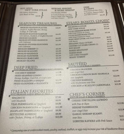 Outstanding Great Diner; super large portions, I had the Salmon, my wife the Tilapia, and my daughter the shrimp salad, we tasted all three dishes, we were so pleased, every and each meal was superb, first-rate. We enjoyed so much we are going back for the same dishes! and the prices are unbelievably low.