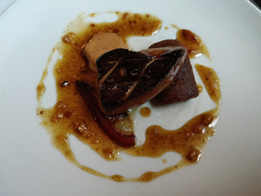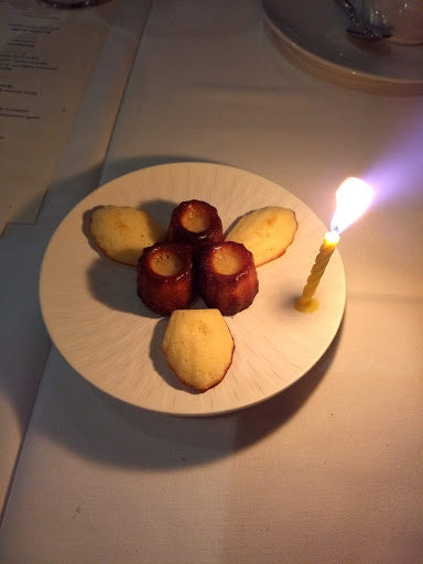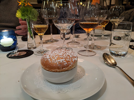 Food: 3 Decor: 3 Service: 4 Came here for their Sunday $45 4-course prix fixe after snagging a reservation 3 weeks in advance. Its hard to find parking in the area, but I managed to finally find a spot in the parking lot next door after circling around for 15 min. 1. Consomme ~Pretty good. 2. Foie gras with grilled apricot ~Pretty good. Foie gras was tasty, although I was hoping itd be smoother and more buttery. 3. Sea bass ~Delicious. Easily the best course of the night. Bass was cooked perfectly, and the broth was quite good. Side veggies were decent. 4. Frozen souffle ~Okay. More like frozen ice cream (cant remember the dessert Im thinking of). 5. Macaroons and cookies ~Mediocre. A bit too sweet, and I only had a bite of each. Service was good, although it was odd when the server came back and told me there was only 1 bass left and asked me to switch to another fish. Luckily, another server came by and said that I could have the bass.