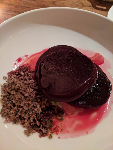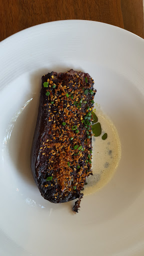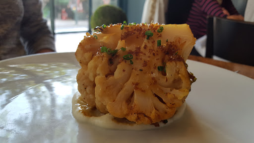 Roasted eggplant was delicious, as was the romaine salad w/buttermilk dressing. The roasted cauliflower entree stood blandly alone without even a smidgen of a side. One is indeed a lonely number. The Arctic Char had nicely seared skin, but a mushy texture. Both entrees had very bad seasoning; first time we ever had bitter olive oil.