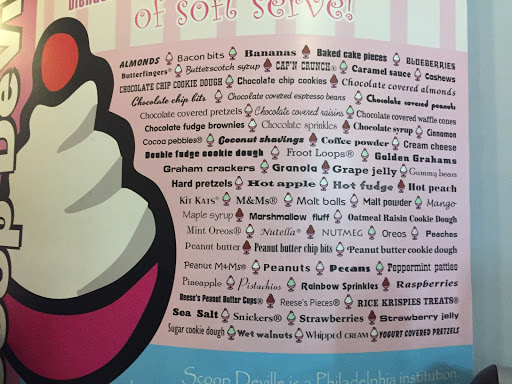 This is one of my favorite places to eat ice cream. I wish they had more in Philly. Theres sooooooooo many mix ins. Like two pages worth. The possibilities are endless here and the staff are so friendly. I think this place is better than cold stone ! My favorite thing to get is chocolate ice cream with banana , sea salt and chocolate pretzel mix ins !