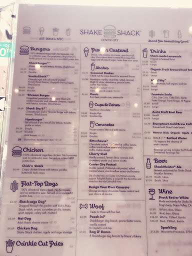 Great burger and shakes (and beer). Decent prices. If youve never been to Shake Shack the set up is such that you have to get in line and order from the window and then they will call you when your food is ready. One issue is that it can be tough to grab a table during peak times. But dont worry if you cant, just grab it to go and take it down the street to Rittenhouse Square.