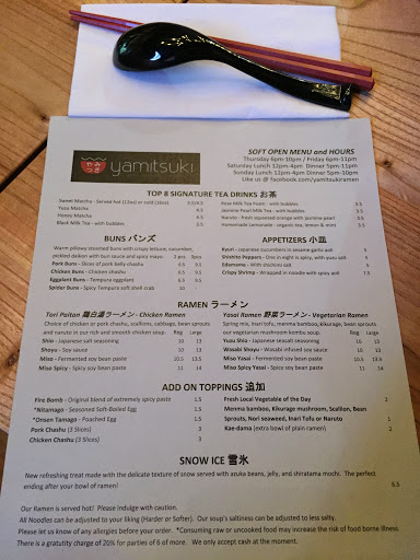 Excellent environment and a much needed addition to phillys culinary pallet! The ramen here comes in a chicken base broth and one bowl is more than enough to fill you up, trust me. They use prime ingredients and offer a choice to add the a vegetable of the day to your soup. Ingredients are fresh, crisp, and the daily vegetable is bought from local produce vendors in Chinatown! Swing by Yamitsuki for an authentic, yet relaxed atmosphere.