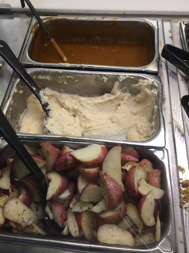 I dont like this location much. There was no greeting when we walked in. We went to the counter and the workers just stared at us. All of their food look like it had been sitting out for quite a while as it was dried out even after it was stirred. Most Boston Market restaurants have new potatoes, which are red. They had potatoes that I thought were new potatoes but they were Brown. Luckily, I asked if they were new potatoes because I found out they were not. They were potatoes cooked with the chicken. They were not labeled to let anyone know and I am a vegetarian so it was very important to me that I knew something like this. I got a look like I was the dumbest person in the world for not knowing that they were cooked with the chicken. Also, we attempted to go through the drive-thru as this location has a drive-thru window, but the entire drive-thru box was ripped out of the ground. Im assuming it was being replaced , but there was no immediately noticeable sign to tell you that was what was going on.