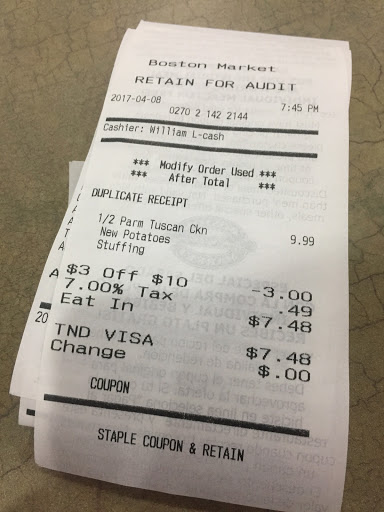 I had not been to Boston Market in a while. I had a gift card so this is what brought me in. The food was good. The pecan pie was even better Lol. Its still the same Boston Market that I can see. This location is convenient. The employees were nice. Ill be back for the pecan pie