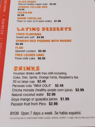 Small, clean place. Peruvian based menu, mostly chicken, hence the name. Reasonably-priced and food was fantastic, great portion size. If youre looking to expand your list of restaurants to frequent, I definitely recommend this place. 8/10, would eat here again.