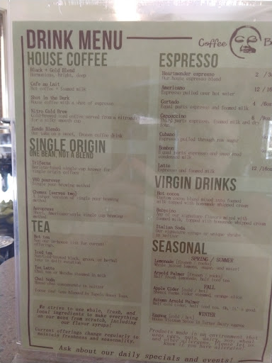 The drinks are good and the atmosphere is unique. Would like to see more available food options like biscotti or scones or something like that. They have an outdoor seating area now and at the end of every month theres a food truck gathering out back.