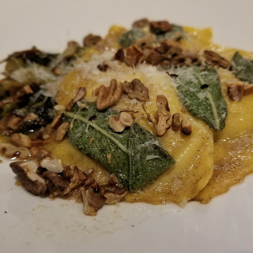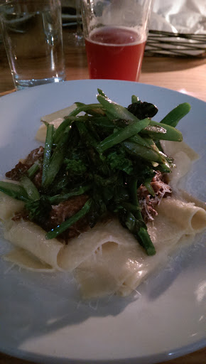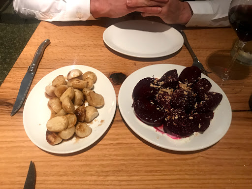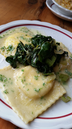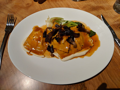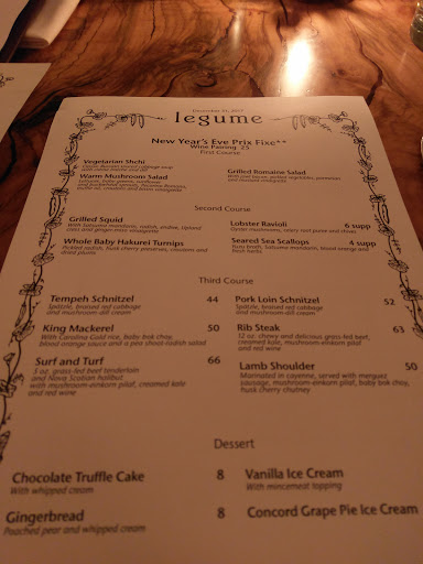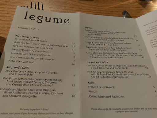 My hangar steak was absolutely phenomenal at Legume, while my boyfriends ravioli left a lot to be desired. Beet greens didnt mesh well at all with the dish, and the heavy full-fat ricotta made the dish overwhelming. The sauce was nonexistant. The price was also ridiculous for the ravioli - $21, while $25 for steak. The dishes seem hit or miss. The service is bizarre; seemingly 5 waiters for 12 tables, always hitting elbows. Its not like its a seven course meal; at most people were getting two courses. Our waiter awkwardly wiped our table off (a wonderful thing at Mallorca, but so awkward here) and then asked if we wanted dessert. Why not ask for dessert first, otherwise were just watching you wipe our table for the next person! Theres no separate vestibule/entrance, so the wind blowing in was a touch uncomfortable, and the outside temp was 70. Ill never go here in the fall or winter unless they change the design. Overall, Ill go back again - just not very soon - if only for the steak, and possibly the vegetarian tasting menu.