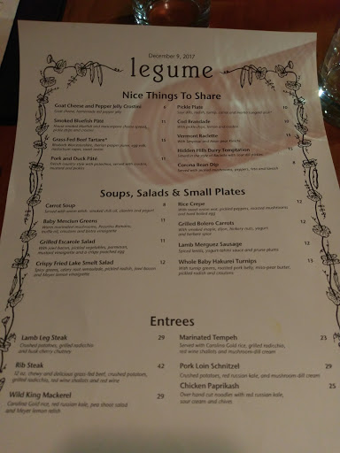 I had previously frequented Legume for their Date Night special that they host once/month (typically the first Wednesday). This used to be a reasonable deal, with an appetizer + entree + dessert + one beer or wine - for two - for just $50. Not only was it a great value, but there were many great options to choose from (3-4 appetizer choices, 3-4 entree choices, 3-4 dessert choices, 10+ beer/wine choices). More recently, the last Date Night I attended (6/1/16), I was disgruntled to find that patrons were now offered only 2 choices for appetizer, 2 choices for entree, 2 choices for dessert. Indeed, my date and I were able to order by saying "Well take one of everything". Not only were there fewer choices, but they were much, much different from the food were used to receiving at Legume. For instance, one entree turned out to be an embarrassingly tasteless rendition of chicken cacciatore, reminiscent of something out of a Betty Crocker box. Compounding the aforementioned issues, you no longer receive a glass of beer/wine with the Date Night special -- instead, you are now given 1-2 beer choices to choose from, at just $1 off of their normal price. That takes the cost from $50 up to $60+ if all you get is a single drink, each. A minor issue in light of the above, but we also ordered an additional appetizer from the main menu, expecting that we would be undersatiated. We asked if it could be brought out with our other appetizers, which we were assured was no problem. They never did arrive as such, in spite of the fact that we were one of maybe 3-4 tables left in the restaurant. When our entrees finally came, we had to ask about the appetizers whereabouts. We were assured it would be up in just a couple minutes, and our appetizer finally did arrive just moments before our desserts. I really wanted to like Legume, and they were starting to win me over for a little while, but with these recent changes to the Date Night specials and poor quality service at times, I cannot possibly justify spending $60+ to bring my significant other here. Simply put, there are much better places to spend your $60 if youre looking for a date night with some drinks. Shame...