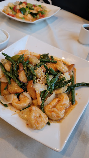 Good food, a little pricey. Lunch specials help a little bit with that, bringing the price down on most dishes to 8-12 dollars, which generally include a choice of soup/eggroll and steamed/brown/fried rice. Keep in mind, items such as Pad Thai (which is great and plenty by itself) and sushi do not get those extras. Speaking of sushi, it is decent, but prices for those range from 5 to 20 for one roll so it can get quite expensive. Of course, if youre a big sushi fan, youre probably used to those kinds of prices. Fyi, spicy salmon/tuna/butterfish is 6 if you like those, and the sweet potato roll is surprisingly great. Service is generally good, the waiters are nice and check on you relatively frequently--when its not too busy, at least. Not sure how it goes when the place is packed. The restaurant itself is clean and is quite cozy with a dark color scheme and some nice mood lighting. Some of the tables are next to the large windows overlooking the parking lot (if I remember correctly), and although its not the prettiest view, its still a decent plus to have. It also opens up the restaurant a little bit and lets it breathe, if that makes any sense. Overall, its a nice place to go to if you want a slightly higher end Asian restaurant than whats usually the standard. Good place for a casual date or a somewhat important but not too important occasion (e.g. familys in town).