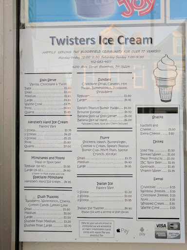 Twisters has fantastic ice cream for a great price! They have a walk-up window that is wheelchair accessible. There is nothing better on warm summer nights than getting a twist cone with jimmies and chillin on a bench!