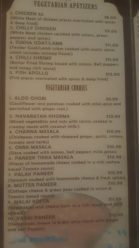 Great food excellent spice. Great service diverse options for vegans and vegetarians and fairly priced.