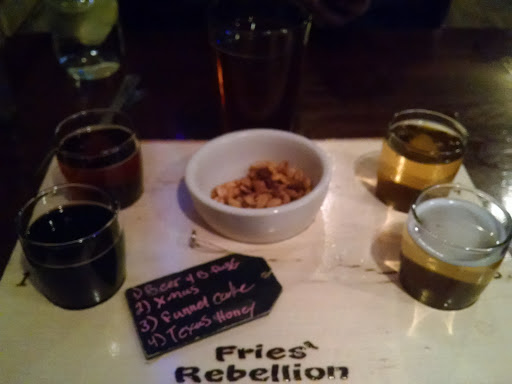 I absolutely LOVE Fries Rebellion. Its not a "pick up" bar. Its not a "sports bar". Its not a trendy dive. Its a nice, comfortable, casual place where you can ask the bartenders to make you drinks NOT on the menu without drawing a blank stare. Craft beers, most liquors, and lots of food choices are on the menu & you feel like you "belong" whether youre out in sweats or dressed up from dinner somewhere else. They have FRIED PICKLES! OMG! Theyre so good! And you can easily order a few apps to share & they always have events & cool local LIVE bands. If youre looking for a pick-up Nightclub or a typical Pub with everyone drinking $1 Coors Light...this isnt your place. If youre looking for subdued class & a variety of drinks/food with friendly bartenders & a place to go after dinner with friends or even a casual date night....this is it. I cant even believe this isnt on Yelps Top Ten places in Q-town considering the other places are mostly places where you find Coors Light on tap & sports blasting in your face. This is a nice, clean, atmospheric break from typical dives and sports pubs.