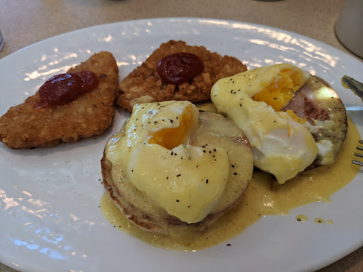 Not bad typical dinner food asked for crispy bacon but didnt get it I asked at my home fries be flipped and burned on both sides that didnt happen either but they were still really good home fries. French toast looks great but when you taste it it just really really Bland. One person in our party ordered the crabby Benedict which says that its served over crab but its really served over a crab cake in the crab cake isnt very good mostly all breading wouldnt recommend it average ticket was $15 person kind of pricey for breakfast but you do get a lot of food