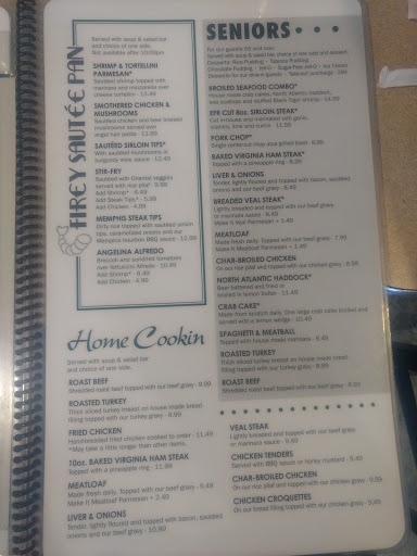 Great place I mean really. Food is consistently better than average. Over 55 menu is great, salad bar is fresh, soups are above average good AND the witnesses are wonderful mostly lol. Occasionally have had less than stellar service but even then would be considered routine in other places. Does it show how much I enjoy this place