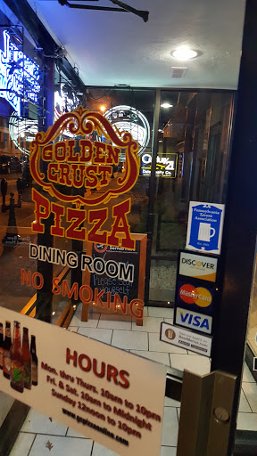 My wife and I have been going to Golden Crust for years. We try to find the time to go in at least once a week. Service is always friendly and competent and weve never had a meal there that we werent well pleased with. Their prices may be a hair higher than some of the other places but its well made up with quality and being able to walk away well satisfied. Their new tap room is small but all together they have 40 some taps..! The only negative thing I have to say and Ill give my opinion to get around it is that the dining room is too small. We tend to try to go either early, before 5PM, of late, after 7:30PM, to avoid not getting a table. They have a pan pizza and I ask that they push more of the dough to the crust and wow was it good and I nick named it the Super Crust Pizza. We love ours with mushroom, onion, and Sweet Peppers instead of green peppers, big difference. Where else can you find an 18" sub or chopped steak sandwich..? The deserts are pretty good also..! Im so glad I live a small distance away or Id be gaining weight eating there daily..! lol..!!! Viva Golden Crust...!!!