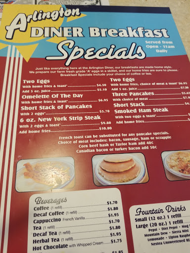 absolutely the best fresh and home cooked meals ever I go once sometimes twice a week in the morning theyre breakfasts are fantastic and they have a great staff working there who would welcome you with open arms, if you are looking for a good home cooked meal and a good place to get together with friends for laughs and fun go to Arlington Diner and you have the best meal and experience possible