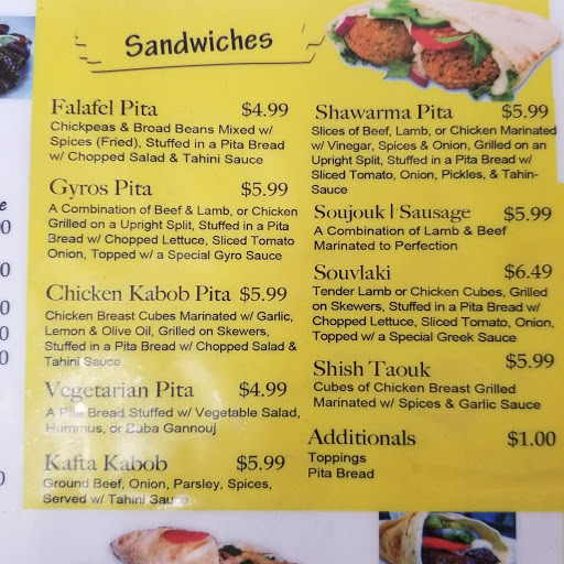 Walked in twice, and twice he did not have half the menu. Whats the point of having a menu if you cant follow it. First time came at 12:00 and the guy said he ia about to be very busy at lunch so no Shawarma or kababs. Second time came at 4, and the guy said he had a busy lunch, so no Shawarma or kebabs...had a gyro sandwich the first time though and it was pretty good. Hence the three stars. Place has potential, needs to stop being lazy.