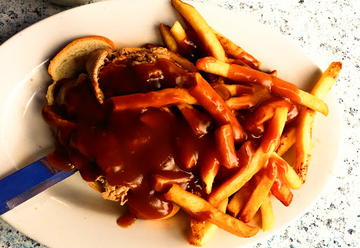 The best hot beef sandwiches ever. Like eating outside. To dark inside.