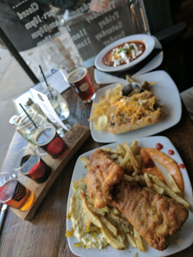 If you havent experienced this brewery yet, now is the time. There is a reason this place has been getting rave reviews and I can tell you from experience I know why now. We went on a busy Friday night, greeted at the entrance, and was told the wait would be approx. 20 minutes. We were then told if we would like we could grab a drink at the bar while waiting, and we did so. Fortunately, seats opened up for us right away at the bar, and we ordered a few beers to start (smitty werbenjagermanjensen pale ale) excellent ale to start the night. The bartenders were polite and the service was quick. Soon enough we were approached by a member of the staff letting us know our table was ready. I decided to go with a classic fish and chips meal and ordered a few more beers. I can say I didnt come across a single beer there that I didnt like (pale ale/IPA/stout/belgian/double IPA) all were delicious. Although the fish was fried a little too long for my taste, it was complimented by a tarter sauce which also had a apple taste if, Im not mistaken, to it as well. Everything was reasonably priced from drinks to food. All in all this was an excellent visit from start to finish and we are looking forward to our next visit soon.