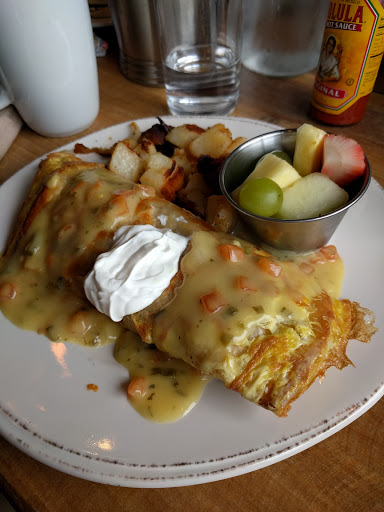 Really nice breakfast/brunch spot! There is often a wait, but they offer complimentary coffee, which is nice touch and helped me stave off hangriness. The food was good and very fresh. Menu is full of nice upscale touches, like greens with my omlette, and great whole grain toast. They are busy, and the food takes a little while to come out, so its definitely not the place to go if youre in a rush, but the prices and food are worth it. Perfect for a weekend brunch spot.