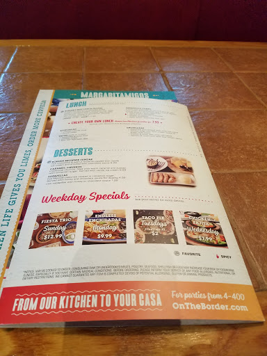 Im a big fan of tacos, but the past few times weve gone here, theyve been soggy. I had this problem a few years ago. In the mood for Mexican, we decided to try On the Border again last week to see if it would hit the spot. I ordered the chicken fajita tacos and I was hoping they wouldnt be served dripping like they had been last time. Unfortunately, they were. The meal included two tacos but it was difficult to eat them as such, because both shells became soggy and ripped at the bottom due to the overabundance of sauce. I was hoping to give them a better review this time around, but in the end I had the same bad experience with the entree. The appetizer and the dessert, though, were very tasty. The empanadas were served crispy and very hot. For dessert we tried the sopapillas, which came with honey and chocolate dipping sauces. While both were very good, I dont feel that they redeemed the main course. Compared to last time, I think that the service has definitely improved. Our server was energetic and friendly, and she checked back on us at appropriate times. She made some good recommendations and we didnt have to wait for the check. She had a very positive attitude. If you want truly authentic Mexican, I cant say that On the Border is the place to go. For those who want something with more of a restaurant chain feel and quality, this might be your place, but I dont feel that this restaurant is on par with some of the cocinas mexicanas in the nearby area.