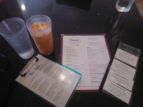 I live about 5 minutes walking distance away from Esaan & thought I would go there with my boyfriend for a quick bite to eat. First we had to wait almost an hour for a table, then the menu had only a few items on it compared to other Thai places Ive eaten. Nearly TWO HOURS later, our disappointing dinners were delivered to our tables. Yes, I suppose the vegetables served in my Pad Siew were fresh, but everything was bland and tasteless. My boyfriends shrimp stir fry was delivered with THE TAILS ON which meant he had to dig through his hot plate to de-tail the shrimp that were apparently frozen and TASTELESS as well. I dont know how they managed this, but even the hot sauce was NOT hot!?! This was my boyfriends first time here, so needless to say HE will never be going back. There was ONE waiter for the entire restaurant which was jam-packed (only 24 or 28 seats available in the place) and the owner proceeded to schmooze and chat with his friends who were eating there while making NO EFFORT to help serve or make things go more smoothly for everyone who was waiting for their food. Another table of 4 had 2 plates come up while the other 2 people sat there and waited for at least another 15 minutes for their dishes to be served. Another customer was told there was no brown rice when they tried to order that (for an added cost, no less). All in all, this experience was a nightmare & I will be hard-pressed to give this place another chance as my first lunch time experience there over a year ago was not too good either.