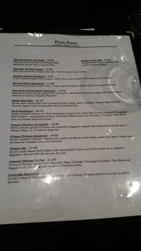 This is my favotite new place to meet friends for a quick casual meal, or enjoy a longer dinner with family/ friends. The food is always exactly as anticipated, and Im never disappointed. Always fresh. Its also affordable, and for that Im really grateful! Front Porch is genuine, it dosnt feel stuffy or fake and contrived like other nearby "upscale" cafe. Fresh and crisp salads; and staff are helpful if you have question about menu. Also, I DONT feel like we are crammed into a cluttered dining room w/ tiny little tables (like a sardine).There is plenty of elbow room between tables, and the different dining areas are all equally elegant, no pretentious buffoons guarding the front door, and we feel very welcome when we enter. Coffee is fresh, never bitter (like the attitude of lady at other nearby Cafe that has the word blue in its name). The BYOB removes the pressured to order overpriced wine/cocktails. You wont be bullied or shamed here to "up order". We Always leave cheerful. If you order desert, be prepared to share because everyone will want a bite. Thank you Front Porch Cafe for the years of good food and service!