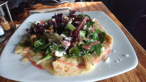 Terrible service. Took 20 minutes to get a drink. Waitress did not know how to make drinks and so had to wait for the cook to make a drink. Salads were OK but waitress ran away before I could ask for salt-and-pepper which was needed because salad was otherwise bland tasting. Spinach crêpe was just OK. Fig and prosciutto crêpe was almost all salad. Would have appreciated the waitress telling us that seeing as though my husband ordered a salad with his crepe. Menu is very very limited. We ate outside because the inside had a very weird smell. Noisy traffic with a gas station across the street does not make for a very exciting fresco dining. Disappointing at best.