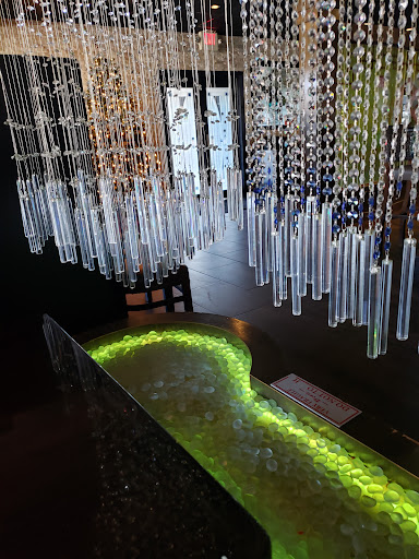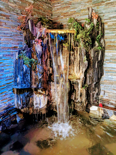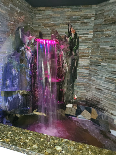 and what a gift. From the moment you walk in the vestibule where there is a lovely waterfall and step thru the bejeweled doors, it is truly a remarkable experience. Firstm the decor is stunning. Walls of crystall beads hung over a lit blue pebble runner separates the dining area from the bar. The walls are covered in stone, several different stone patterns are used throughout the restaurant and lovely tile floors. A row of bamboo sticks lit from below by coloured flickering lights adds a serenity to the dining room. The beautiful blue is echoed in the lighting below the bar and in the sushi section. There are several etched windows separating the hibachi room from the bar. The decor melds east (sumptious coverings on the booths) with nature. All that is icing because without good food what is a restaurant worth? The food here is well prepared, delicate flavors and sauces, beautifully presented by a well trained wait staff. Bravo! And welcome to the neighborhood.