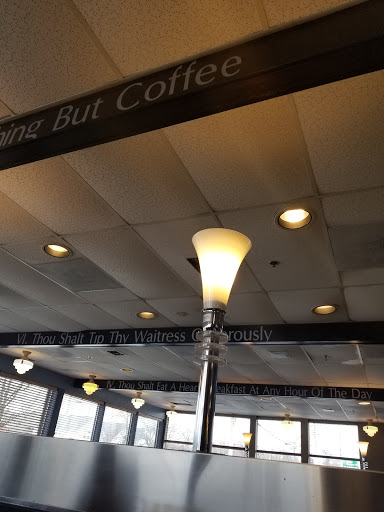 Great food, great prices, and GREAT service: owner to cook to hostess to server to staff. Breakfast, lunch, dinner. Breakfast all day. Try the Greek Omelet or the Garlic Burger. Specials are awesome. Big tables and booths. I sit, eat, read, relax, no hurry no problem. TV at the counter / bar for sports. Clean. Kids are fine here. My 7 year-old son loves the chocolate syrup French Toast with whipped cream. : )