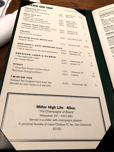 Stopped here on the way to Connecticut. Cute little pub. Very cool venue and atmosphere but would not necessarily recommend there food. I came here with my family and the food didnt live up to the expectation that we were hoping for. We got the fish and chips which were clearly specified that they were not beer battered. Tasted like a beer batter but was not crispy whatsoever and was soggy and bland. Got the gourmet burger which consisted of a burger with Bleu cheese, bacon, horseradish sauce, lettuce and tomato. Burger was cooked almost to perfection but was bland. The Bleu cheese was way too overpowering and just took over the whole dish. We also had a bacon chicken ranch pizza. They have individual 10" pizzas to enjoy by yourself or with a friend. It was pretty good and consisted of chicken, ranch dressing, cheese, bacon, scallions, and apple slices. It was pretty greasy but better than the burgers and such we had. The best thing of all was the lobster soup. It was very creamy and delicious. The flavor was on point and was not overpowering. It was very good. The reason I give this place 3 stars is because the food was a little on the pricey side ($15 about per burger). Also the food didnt live up to the expectations. Probably would not recommend but the atmosphere was pretty cool with vintage things hanging from the ceiling. Waitress was nice though so that was good.