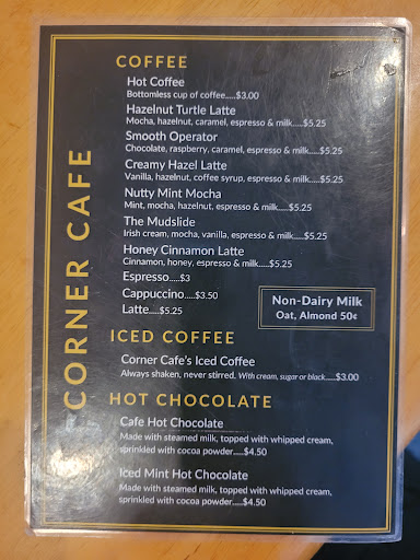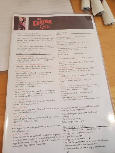Outstanding condiments, outdoor or indoor seating, happy music and artsy atmosphere, lunch tasted amazing. Our table had burgers perfectly done, Marys special chicken the salad were fresh and healthy. The enhanced seasoning really showed the corner cafe does cook and serve food they know and create flavor masterpiece. Thanks for great meal corner cafe