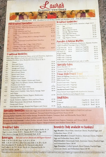 Great local eatery with a wonderful family feel. Laura and her staff seem to know everyone who comes through the doors; and if they dont youll still feel welcome. Good food-great prices. Breakfast, lunch, dinner, drinks, you really cant go wrong. My wife loves the homemade meatballs and sauce!