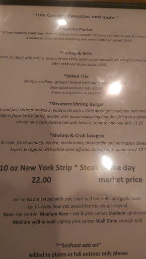 We arrived on a Sunday in mid January at 11:45 and were seated promptly. Mel was a friendly and helpful server. The atmosphere was clean and nautical - dont let the drab exterior fool you. Plenty of handicapped friendly parking, too. We split single oysters - fresh and delicious. I had a cup of the seafood bisque - full of chunky seafood. Mu crab cake was outstanding - not frozen, definitely made fresh. The best crab cake Ive ever had, hands down. The fried green tomatoes were well prepared - crispy not mushy with a hint of spice and homemade remoulade. Mom had the "local clam dish" in garlic white wine. It was delish, but made with New York clams. Tasty but a little misleading. Our iced teas were fresh brewed and kept filled. The country music was a little annoying. A fun bar with games on kept the atmosphere relaxed. Overall, delicious and well certainly return.