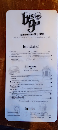 Big Gun Burger Shop & Bar, My wife and I went in on a Sunday around 1pm after seeing a show on food network that was doing burgers. I googled BEST BURGERS IN CHARLESTON and this came up with 4 1/2 stars. We jumped in the car and went downtown. After finding a parking place right down the street we walked into this awesome little place. We were greeted by the bartender and offered menus. We were pleased to see all the awesome items on the small menu. We both ordered drinks which came right out and the Bloody Mary was Perfect with a piece of fresh cooked bacon as a garnish. We ordered burgers which came out nice and juicy. Just have to say Kudos to the staff for getting this little hole in the wall on Calhoun right and treating the customers like friends. Thanks Guys and we will be back. Already recommended you to friends who work in the area.
