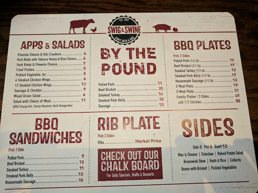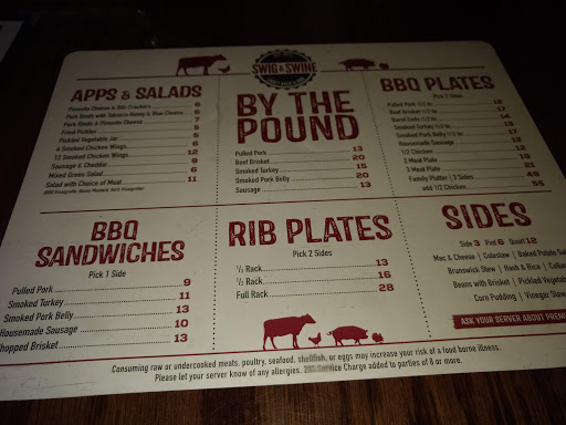 If you were planning on coming here, I suggest you find another resturaunt. This resturaunt offers very limited options for example: you cant get burgers, steak, or grilled chicken peices. Although the desert was good, i was very dissapointed with my ribs and wings. First, the ribs were over cooked and too salty. And 2nd, the wings didnt come with sauce options, usually i can order hot with garlic or mild but at swig & swine you can only get the dry burnt wings. Swig & Swine also doesnt give you straws with your drink. The customer service was great either, they were okay but i didnt feel like they were very nice. Overall, dont bother trying Swig & Swine if you want good food.