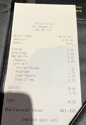I really like Thirsty Fellow. It is a very neat place. Although my waitress recently WAY overcharged me for alcohol. Be careful, the prices can add up quickly here. I split dinner with my friend and my total bill was $42. 42 DOLLARS! This happened because I ordered a long island iced tea. I was charged $4.50 for EACH ALCOHOL used in this drink. This drink ended up costing me about $15. Plus our waitress tried to rush us out the door. All the other staff weve had here has been excellent and I will go again, just not with that waitress.