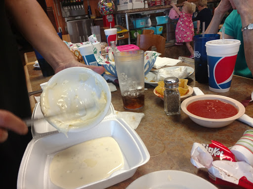 In trying to eat healthy, its difficult to find something thats not covered in cheese, so I ordered the tortilla chicken soup, which is broth based and had rice and fresh avocado slices on top. It was in a huge bowl, bigger than Paneras. If Id not been traveling through Id have had half put in a to go container, or split it. Very tasty and fresh! My family enjoyed their chips and 2 salsas, chicken chimichanga and the taco salad with steak and chicken mixed. We sat in the arcade side, which is very family friendly if you have little kids. Lots of games with tickets you can win and trade in for little prizes. The regular dining area looked fine. Prices were reasonable for the fresh offerings. Many varied choices on the menu. I always check the reviews of restaurants in towns we stop through while traveling before we go out to eat, and this was a good choice for us. Thumbs up!