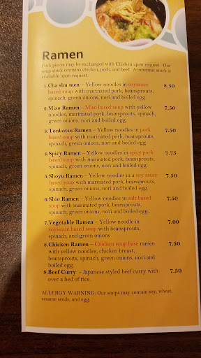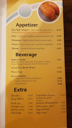 Excellent food and prices. I ordered the Chicken Ramen #8 and enjoyed the big portion of noodles and flavorful both for only $7.50. Id like to see them expand the menu to include some seafood choices rather than just pork, chicken and beef. The layout of the small restaurant is awkward and seating is limited. The self serve fountain drink machine is situated inconveniently amongst the line of patrons placing their orders. Definitely worth a try if youre in the area.