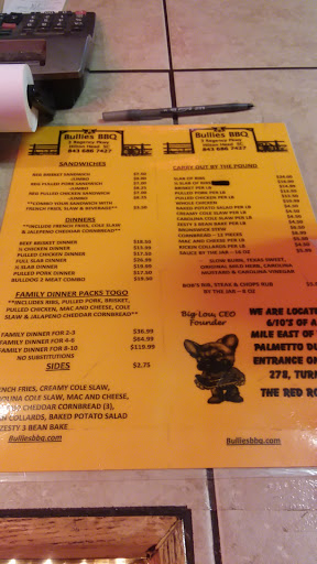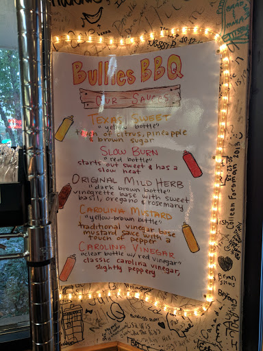 Stopped in for the first time for dinner recently. There isnt a huge seating area, but it seemed like most people were picking up carry-out orders. The prices were really reasonable and we happened to be there on the special night for a full rack of ribs for $16! Great value! We ordered four racks for six people, plus a couple sides of coleslaw and cornbread. Everything was delicious. The rib meat fell off the bone and the selection of sauces was great, there was something for all tastes. The meat by itself was good too, no need for sauce. The coleslaw was pretty good. The cornbread was something special, with cheddar and jalapenos cooked in. It gave the bread a unique taste that wasnt too hot for our kids. We had plenty leftovers for lunch the next day. Bullies will definitely be on my "must have" list for future vacations here.