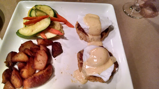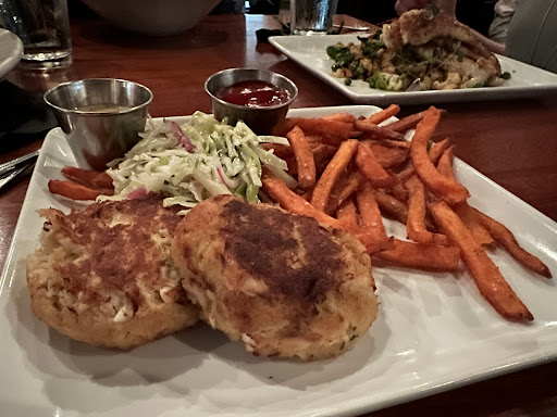 My wife and I had the Calamari appetizer. Entree for her was shrimp and grits and crab cakes for me. Calamari was crisp, tender, and not oily, but the entrees were disappointingly overwrought. The crab cakes were gummy from too much mixing and had the slight ammonia flavor of old crab. Shrimp and grids were positively TeX Mex with overpowering flavors of cumin and cilantro. Not awful, but a far cry from the original, humbly purist roots of both dishes. Good selection of wines and pleasant decor helped dispel the gustatory impression we were at Red Lobster.