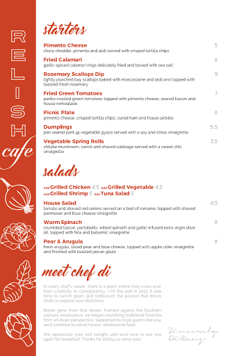My husband and I love good food! We found Relish and we were not disappointed--Everything on the menu looked so interesting and good that it was difficult to choose...We ordered the Pork Dumplings to begin with the General Tsos Chicken and Mongolian Beef, and Bread Pudding to wrap it all up--All were delicious with clean, fresh flavors. While we enjoyed some Asian dishes, we cant wait to go back for breakfast AND lunch to try more on the restaurants diverse menu. The entire staff was so attentive and our waiter, Attila, and Chef Wang were very gracious.