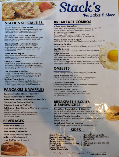 We went there the weekend of 2/20/09. We were passing by and looking for breakfast and stopped. The menu was extensive.....lots and lots of choices. They had a buffet for $9.15. It looked a little skimpy for that price but I ordered off the menu. Pancakes were huge but they were super dry. Between me and my husband we almost used the whole syrup container because they kept sucking up the syrup. For me and my husband to eat it was like $26.00 not with tip. I had a short stack and some hash. He had pancakes and eggs, oh and bacon. I think there are probably a lot of other places that are better on HHI.