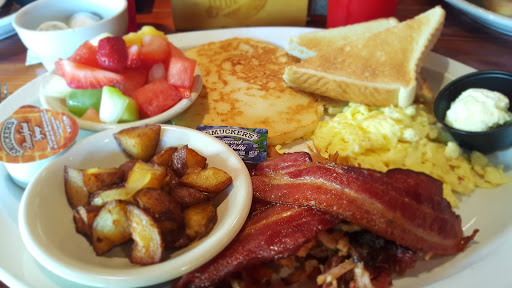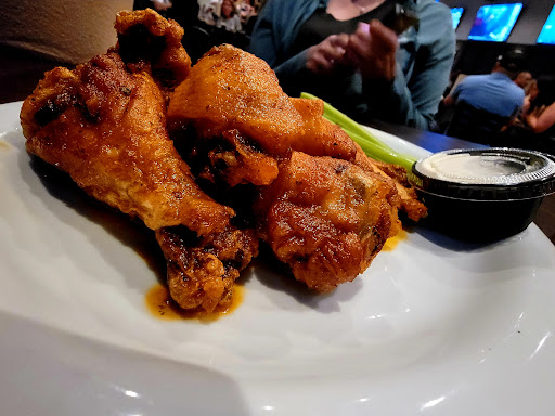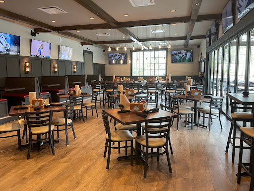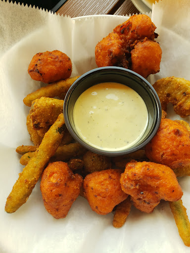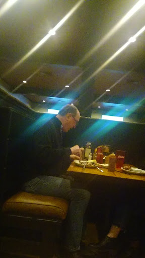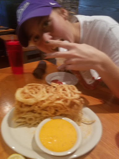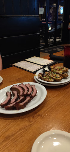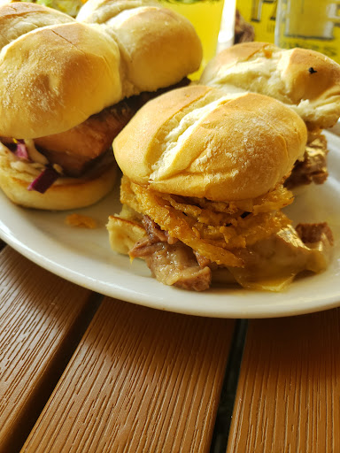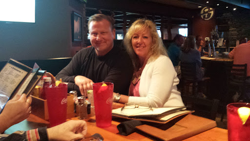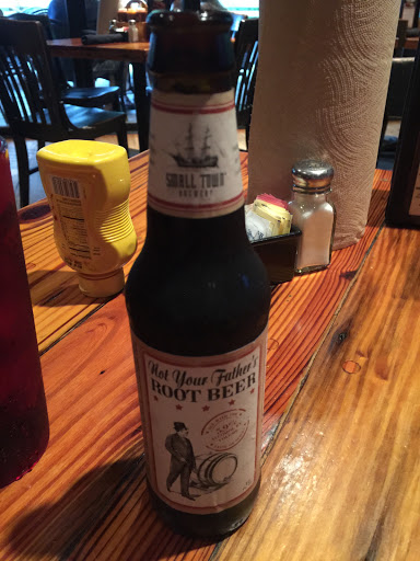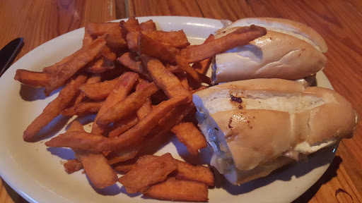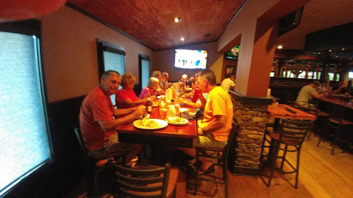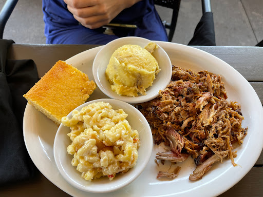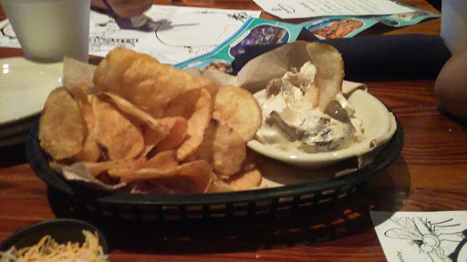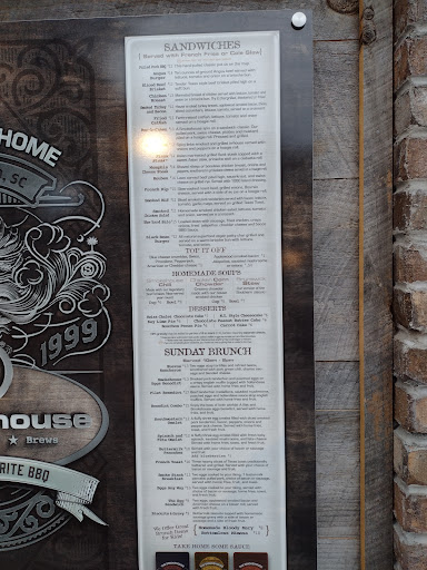 Location easy to find if youre looking, BUT all you see from the road is the sign, so it would probably not be an impulsive stop. Plenty of TVs, tuned to ESPN and similar stations. Bar is located separate from the dining room, and there is an outdoor dining area as well. Parking wasnt a problem, the wait was average, and the dining area wasnt too tight. We didnt go over to the bar. It was easy to stay under $15/person, and even easier to stay under &20/person. We did not have children with us, so couldnt say if kids would like it (there were a lot of families there though). Service: wonderful. Greeted immediately, wait was 25 minutes (immediate if we had sat outside) for 5 oclock on a Sunday. Got drinks immediately, appetizers w/in 10 minutes, food w/in 30 minutes of being seated. Waitress checked on us several times, refilled drinks, and was very nice. Total cost was $57.77 w/ tax, before tip, for 3 adults. Meal: Appetizer was potato skins, which were 1/2 of a potato each, with cheese, pork, bacon, and scallions. They were very good, especially with some of the house South Carolina Mustard. One meal was the bourbon glazed salmon. The salmon was cooked perfectly; moist, flaky, and complemented well with the sweet glaze. The dish came with choice of two sides, which were mashed red-skin potatoes, and cole slaw. The cole slaw was fresh, cool, and crunchy, not saturated with liquid. The potatoes see ok, but definitely made en masse, because they were a little dry and under-seasoned. The corn bread was moist and a little sweet. The second meal was the pork platter. It was a pile of pulled pork, and two sides. The pork was cooked well, very moist. The sides were fries and mac & cheese. Fries were your typical crinkle cut. The mac & cheese was obviously homemade, but average. The last meal was 1/2 smoked chicken platter. The chicken was a tad pink tinge, but it was completely cooked (smoked meats stay a little pink sometimes), moist, and a mild smokiness. Sides were a sweet potato and mac & cheese. The sweet potato was good, but we got a little extra cinnamon for it. Overall, a very good choice for dinner.