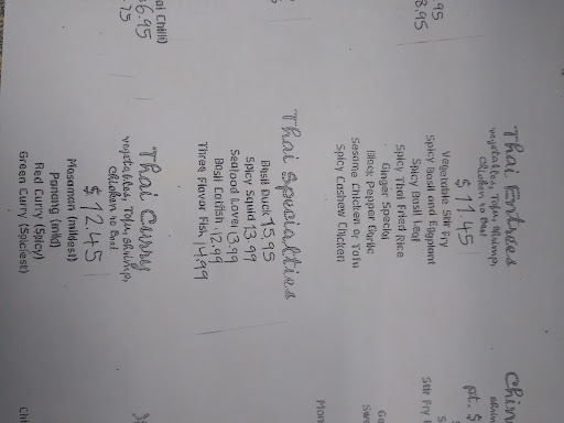 Awesome Thai and Chinese food! Good prices, good quality, fast delivery, pleasant employees and overall a great experience. I have only had delivery, so I have no idea what the inside of the restaurant looks like, but everything I have had so far is tasty. I definitely recommend since Mt. Pleasant has very little delivery options!