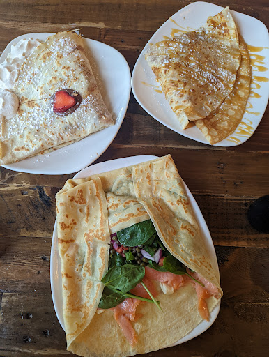 Crepes were excellent. Chicken Florentine, Bonaparte, and apple turnover. Definitely took time to get the crepes out, but it was worth the wait. Very friendly staff. Small (10 tables maybe) establishment, and every table was seated - even on a Sunday evening. Food prices ranged from $5-$7, total came to $22 with no drinks. They offer wine and cocktails and feature Devo olive oils and vinegar. Definite return.