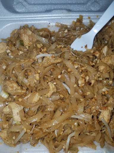 I would give 4 stars because the food was great, but I got a few kinks with my order. I called in for pick up, ordered chicken pad thai, 3 chicken egg rolls, and a small order of fried rice. I was quoted 35mins and when I arrived at about 30mins in, I was told it would be another 30...kind of lame. I wouldnt have minded an hour wait if I originally knew it would be that long, but after a chat with the guy at the counter he gave me 10% of my order, made me happy. Told them to call me when it was done so I could pop into a shop next door. Once they called me, which was 30mins later, picked my order up and drove back to my hotel. I should have checked the bag before leaving. My fried rice that I ordered was plain white rice..major bummer. That being said the pad thai was great, good layered flavor. I prefer more beefed up versions with carrots, mushrooms, and broccoli but this was your standard bean sprouts, onions, and peanuts and not sure if they dont serve with limes but I didnt get one..glad I had lemon at my hotel. Chicken egg rolls were pretty delish as well, nothing super special but nothing to complain about. Really wish I could say something about the fried rice, but I didnt get it.