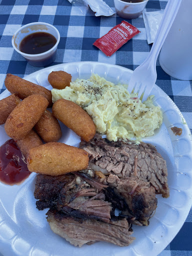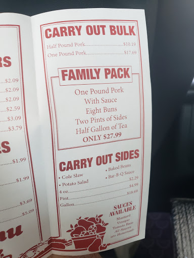 Very nice lady greeted us when we walked in, limited on the Bbq, but you can tell its freshly made, small cozy location, homemade sauces were good, food was good, sad they only have ribs on Saturdays, pulled pork was as good as it gets around here, fries, Homemade beans and hush puppies made for a GOOD lunch, worth the experience and fairly priced! Gotta try it for yourself , dont judge this book by its cover...