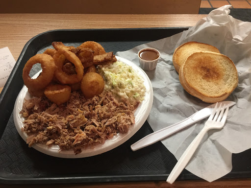 Young guy at the counter didnt seem too interested in helping us. We were the only customers there when we got there. They only have one kind of bbq, chopped sandwich. We got one sandwich plate (comes with 2 sides) and a coke. 10 bucks and change. I thought it would be amazing for that price, but it was just okay. Sides, hush puppies and onion rings were nothing special either. The guy at the counter also brought some rifles in to show the older guy (the owner?) while we were eating. Kinda scary. They were friendly with the locals, but didnt seem to have a lot of patience for someone looking for ribs or brisket.