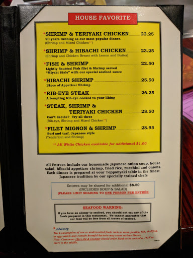 This is by far my favorite chain of Japanese steakhouse restaurants. They have locations around the southeast, with two in the Myrtle Beach area. First, the food you get is high quality and the portions are huge! A take-home box is usually required. Everything is good here, from the sushi, to the hibachi meals. Their fried rice is incredible! The filet is cooked to perfection. The atmosphere and service is hard to beat. Its a great place to go to with a group of people, but probably not the most intimate surrounding if you want a quiet night out for two. If you want to try it out, get there before 6 pm. Theres almost always a crowd-in-waiting (parking lot overflowing!) if you get there any later, plus they have good early bird specials. Highly reccomended over any Japanese restaurant in the area.